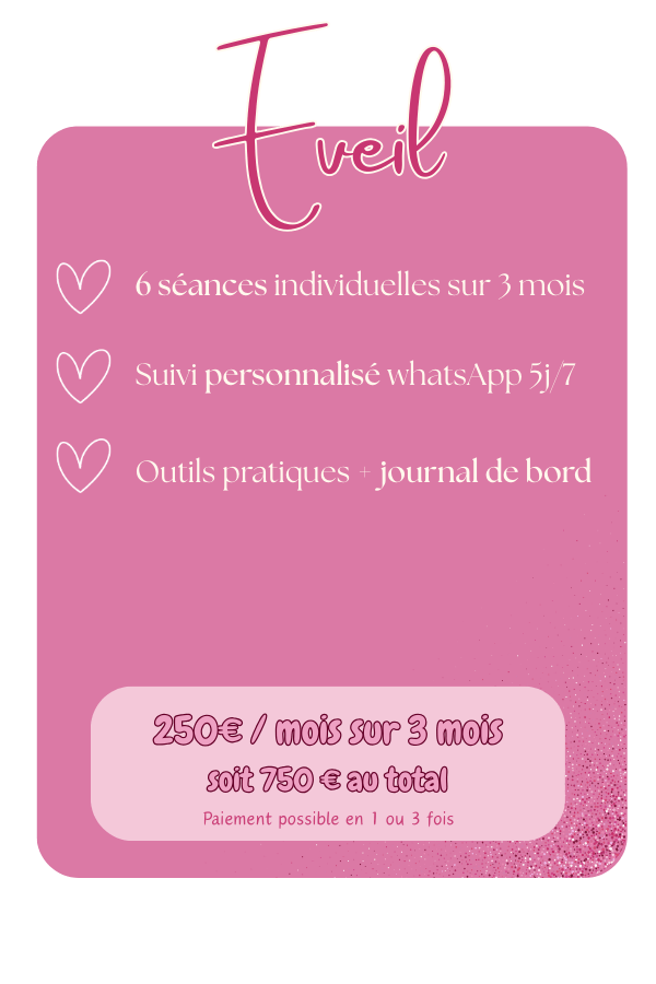 Tu repars avec une présence bienveillante et continue, une compréhension sincÚre (parce que je suis passée par là ) et des outils concrets personnalisés qui font que tu ne seras plus jamais seule face à tes doutes.