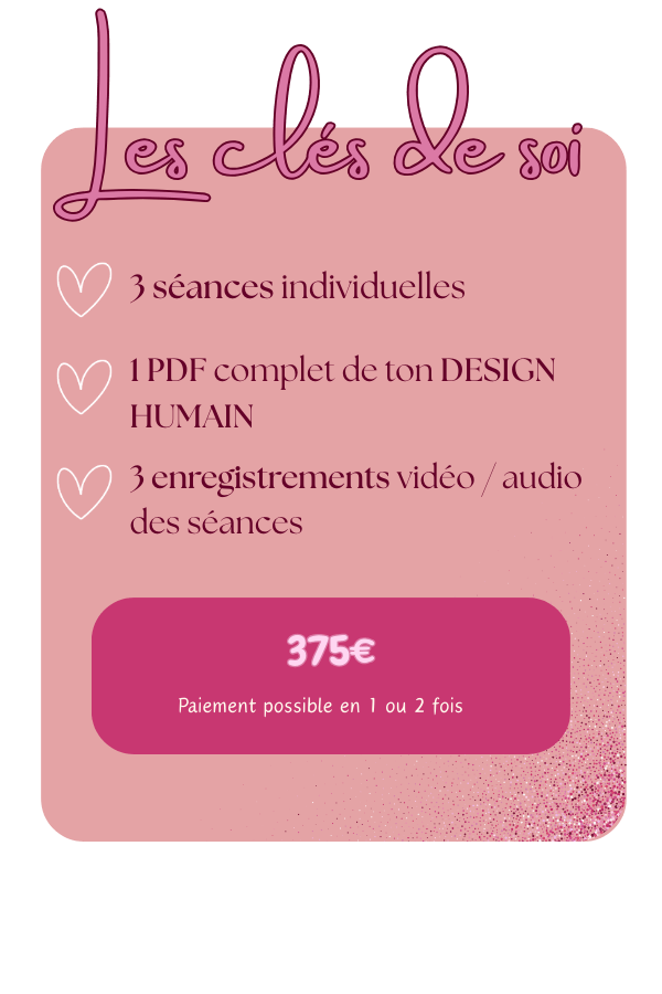 Mon expĂ©rience de 20 ans en accompagnement et mon rĂŽle de Projecteur (Human Design), ce qui me permet de voir clair dans tes blocages et de tâĂ©clairer lĂ oĂč tu ne vois plus dâissue.